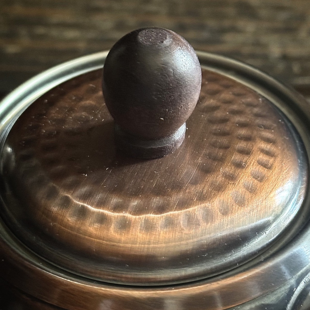 金槌で叩いて付けた細かいポコポコの模様が美しい鎚目急須です。純銅製なので熱伝導率もよくて、抗菌性もあります。持手と蓋のツマミ部分は木製です。1〜2人分の量に最適。