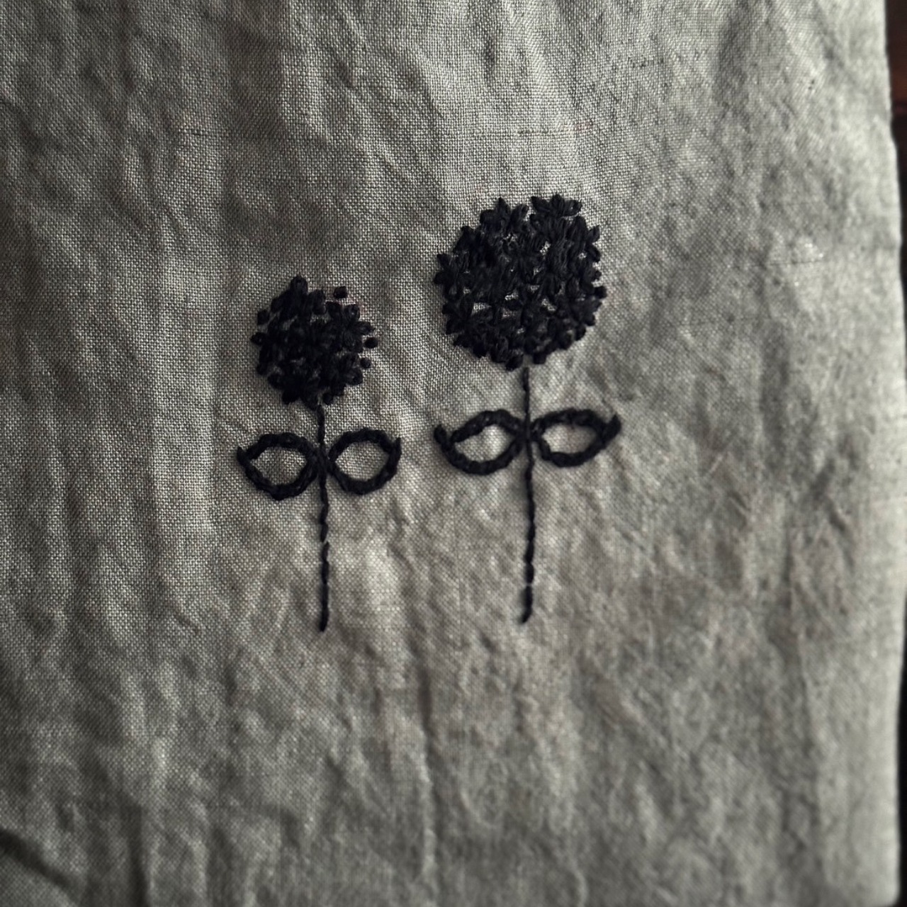 黒一色のお花の刺繍がワンポイント。生地は薄いグレーっぽい色。シンプルで