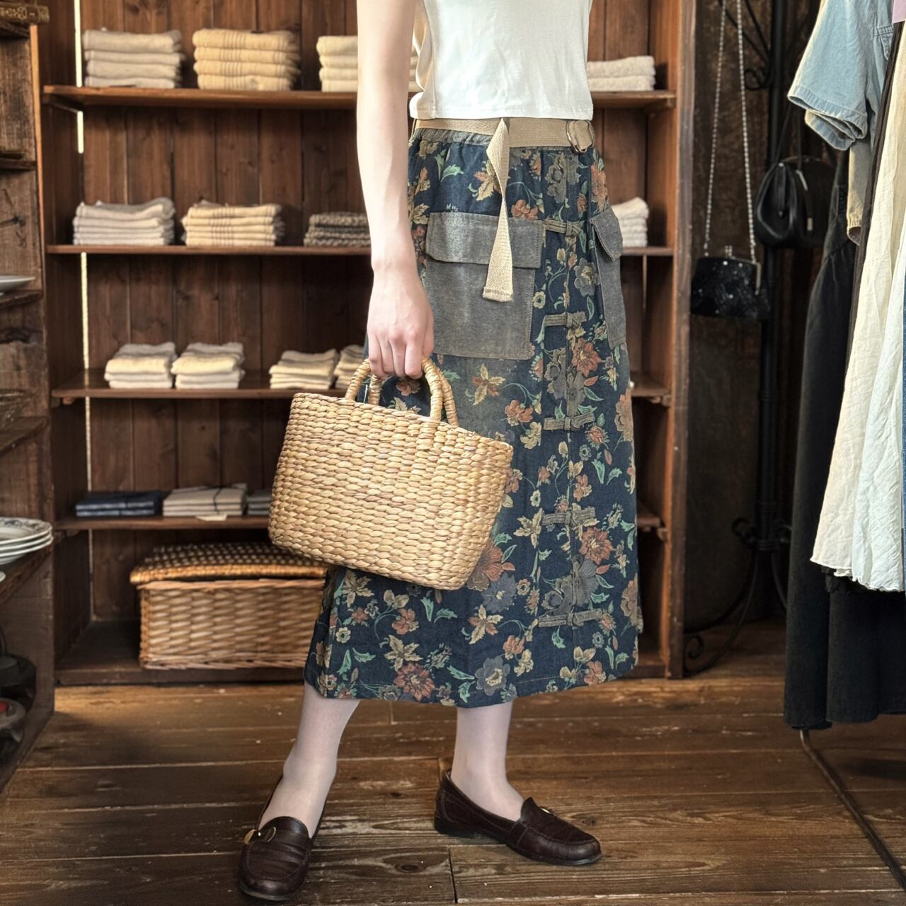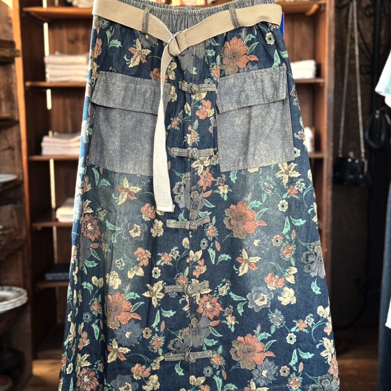 全体的に、アンティーク色のたくさんのお花のデザインがプリントされたユーズド加工のデニムスカートです。