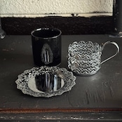 ソーサーのデザインが細かくて綺麗です。カップは磁気で色は黒になります。シルバーと黒のコンビがシックでモダンで格好いいです。