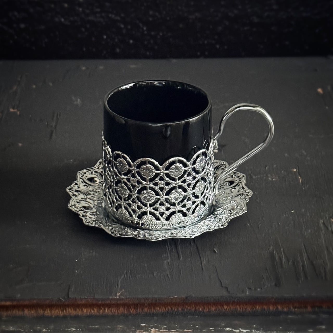 ステンレス製シルバーの透かしホルダーがとても素敵なデミタスカップ&ソーサーです。こちらは2setペアでのお値段になります。
