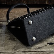 デザインも含め全体的に色は黒。金具部分はシルバー色です。底は厚めにしっかりとした作りで、表面はサテン生地で高級感があります。