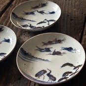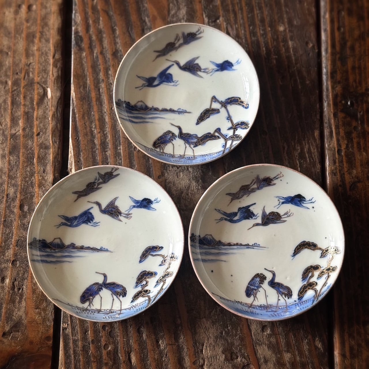 ツルの様な鳥が7羽と、松の木。そして海の向こうに見える富士山。とても日本らしくて癒しのある絵柄です。裏の手描デザインも綺麗。