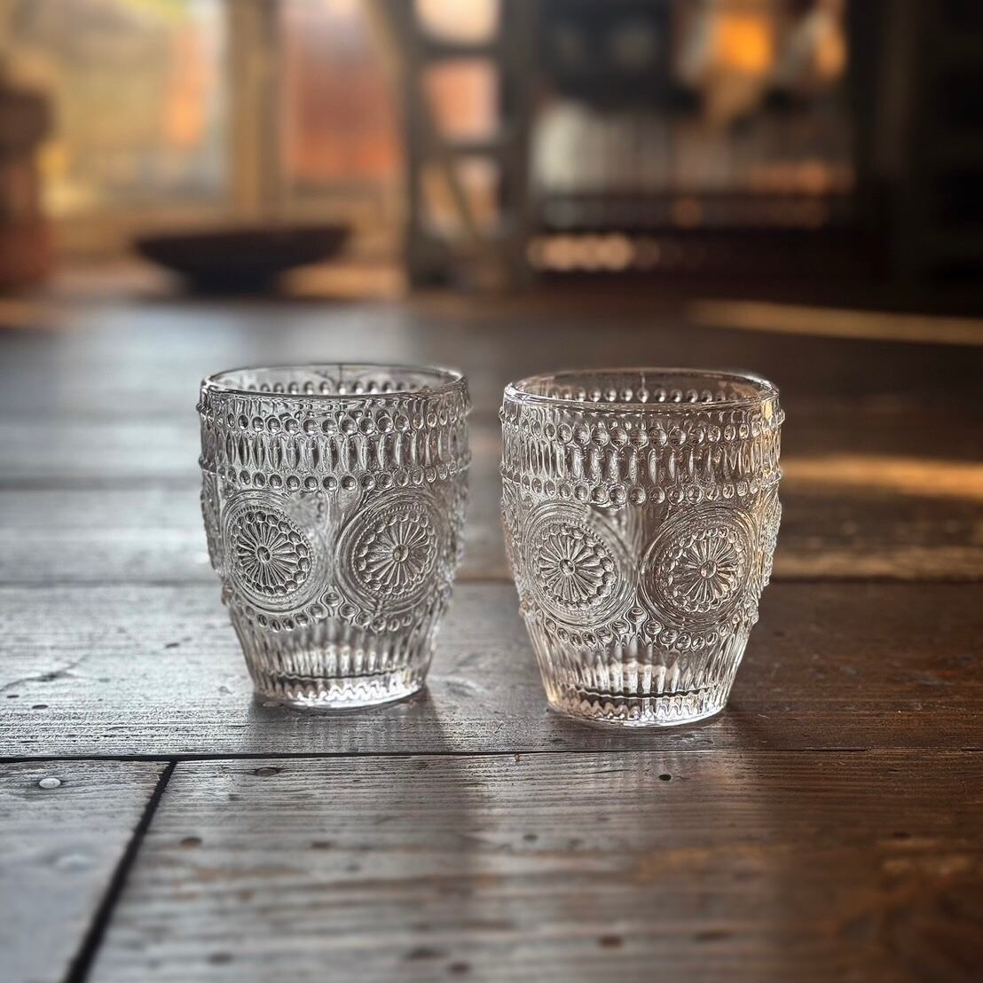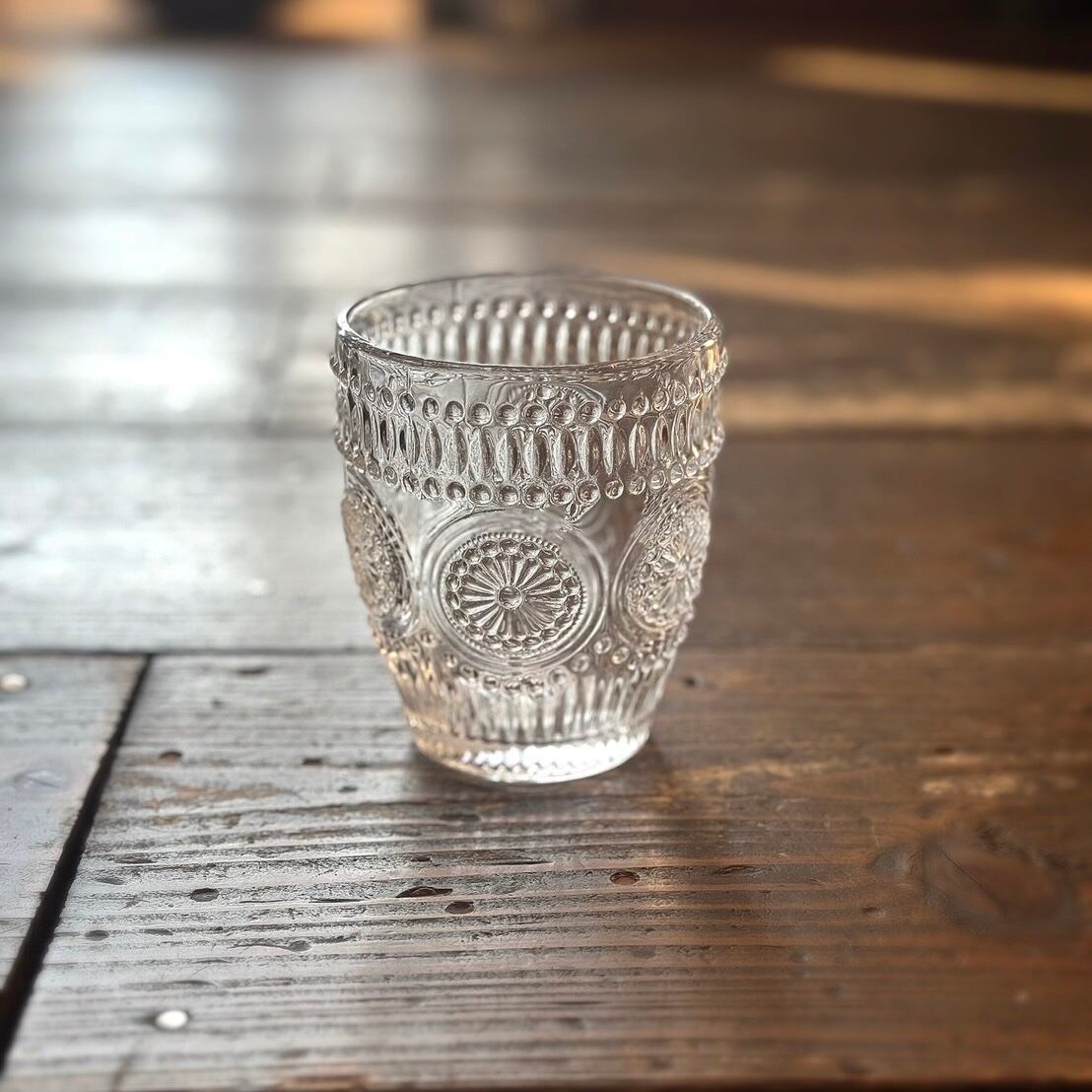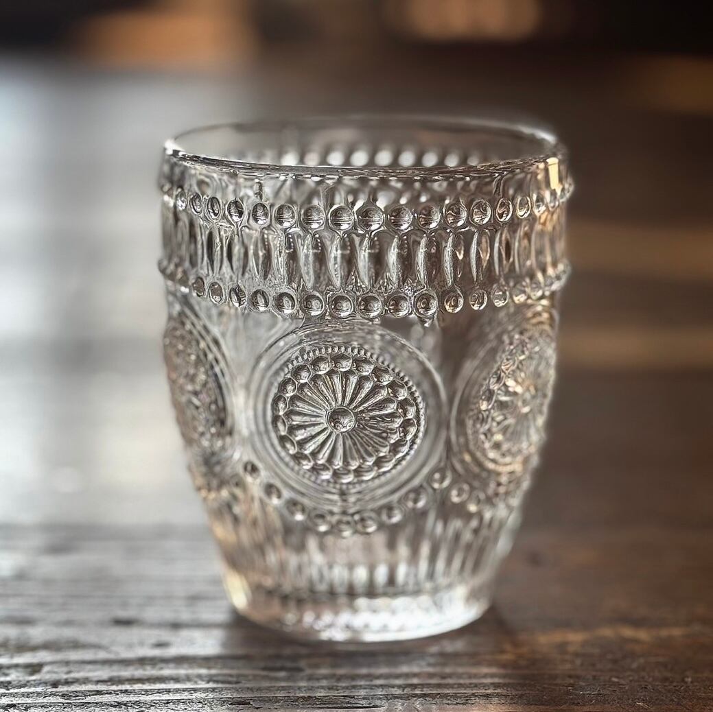 凹凸としたデザインが綺麗なエンボスグラスです。陽の光に当たると余計綺麗さが増します。少し厚みがあって、しっかりと安定感があります。折角デザインが素敵なので普段使いだけじゃなく、来客時などでもお好きな飲み物でお楽しみ下さい。